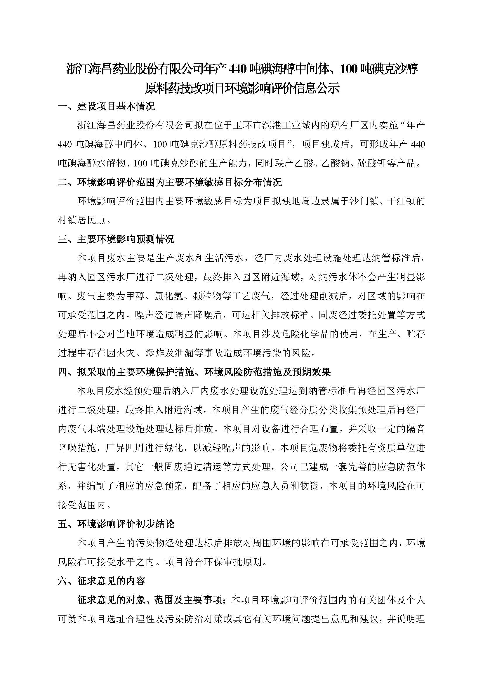 Zhejiang Hichi Pharmaceutical Corporation Limited, planed to launch technical improvement projects on“Annual output of 440 tons Iohexol intermediates?& 100 tons Iodixanol API”at its current existing plant site which is located in Bingang Industrial Zone, Yuhuan city. After being build up, it has a capacity of annual output of 440 tons Iohexol intermediates?& 100 tons Iodixanol API, as well as co-production of acetic acid, sodium acetate and potassium sulfate at the same time.